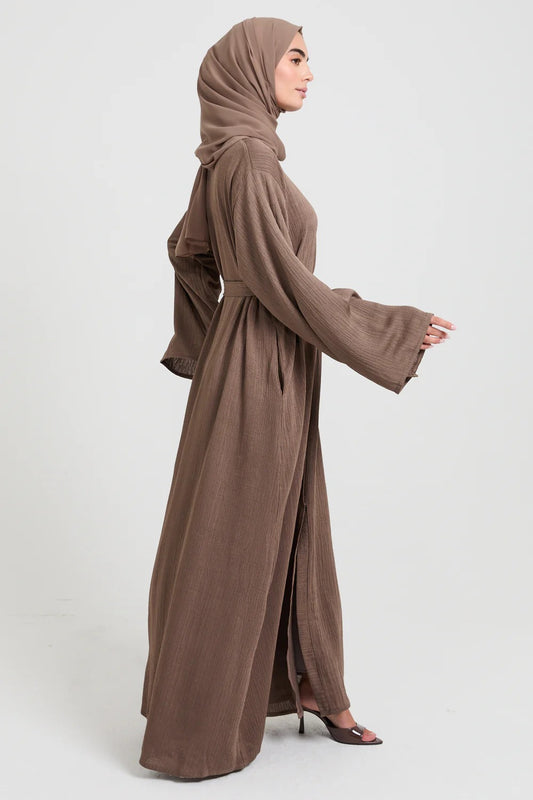 Premium Textured Linen Blend Open Abaya with Pockets - Desert Mocha
